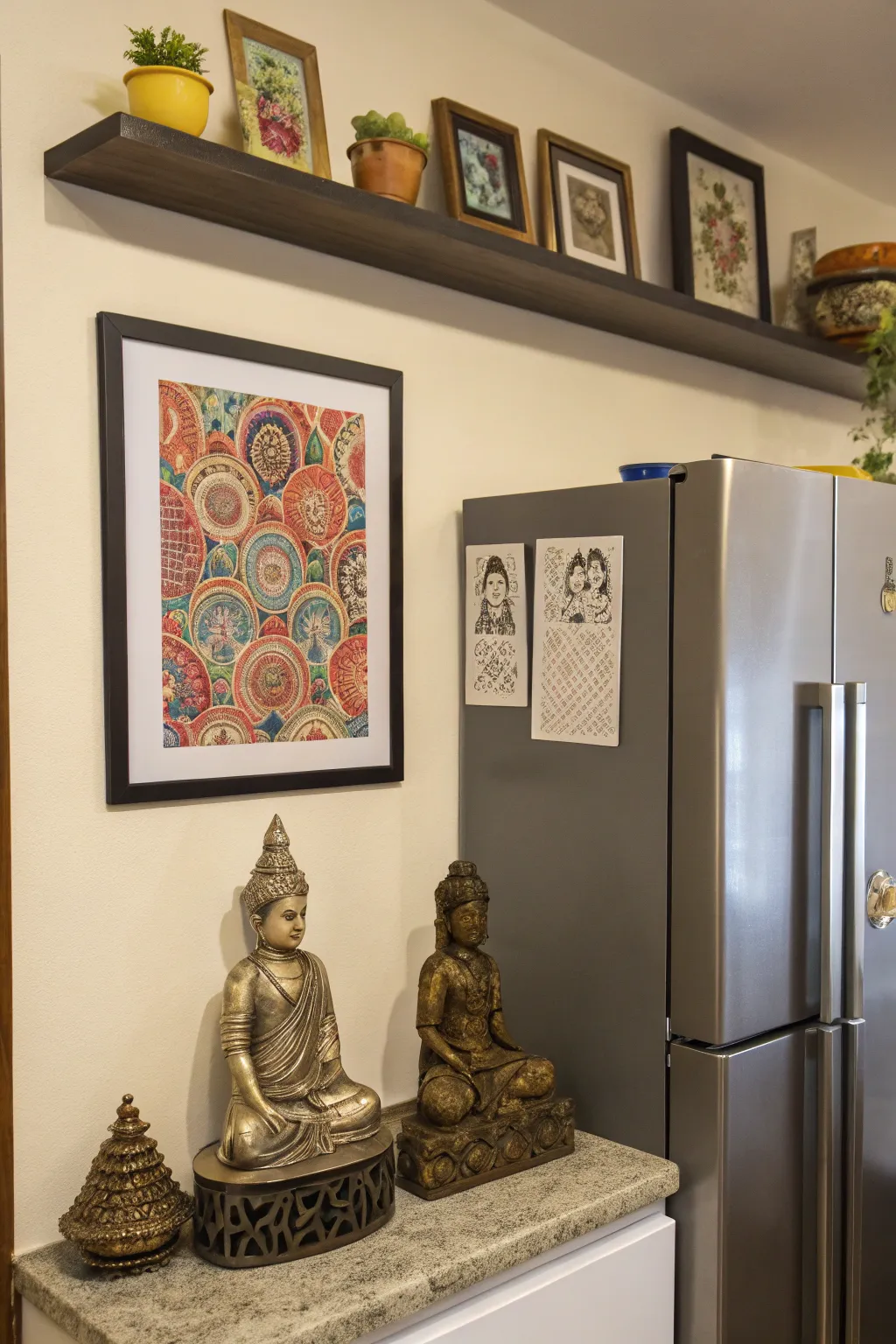 The area above your refrigerator emerges as the quintessential location for exhibiting artworks or decorative items. I frequently advocate for incorporating a selection of petite sculptures and framed art pieces to impart a uniquely personal ambiance. Adds character!