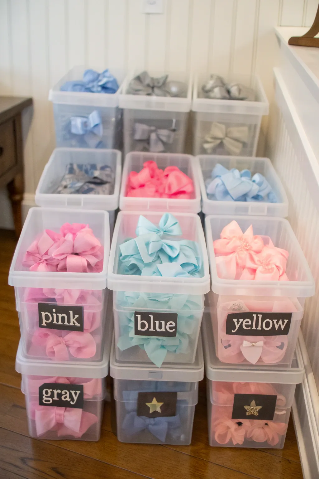 Organizing bows by color isn’t just visually pleasing; it also simplifies finding the perfect match. Use clear containers or trays to enhance the color coordination.