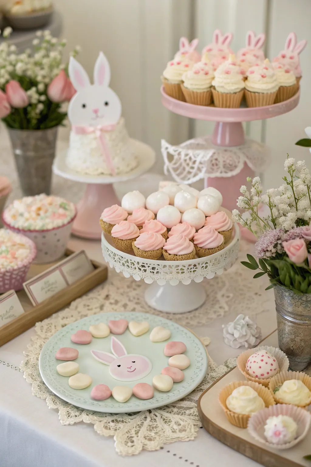 Design a sweet table with an assortment of rabbit-themed treats. Attendees will love the variety and charm of the presentation.