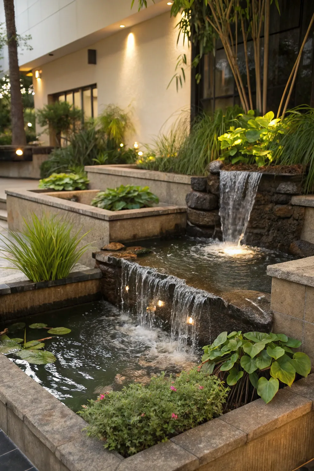 Construct a pond with multiple levels with cascading water between levels. This blueprint maximizes space and introduces a vibrant visual component to your garden.