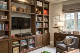Combine bespoke fixtures using shiplap to optimize functionality. I created a custom media hub that blended seamlessly with the shiplap, great for storage and style.