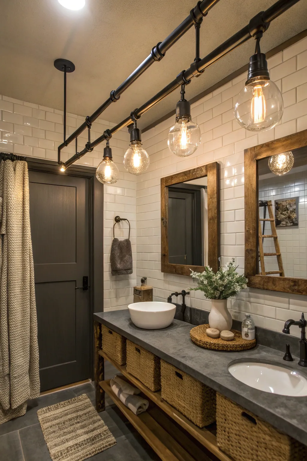 - Factory-Inspired Metal Conduit Illumination Arrangement: Boost your bathroom’s style with a sturdy factory-inspired conduit illumination arrangement for an edgy highlight.