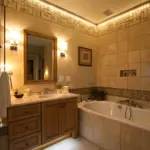- Refined Brass Wall Lights: Illuminate your bath area with refined brass sconces, a perfect complement to any chandelier.