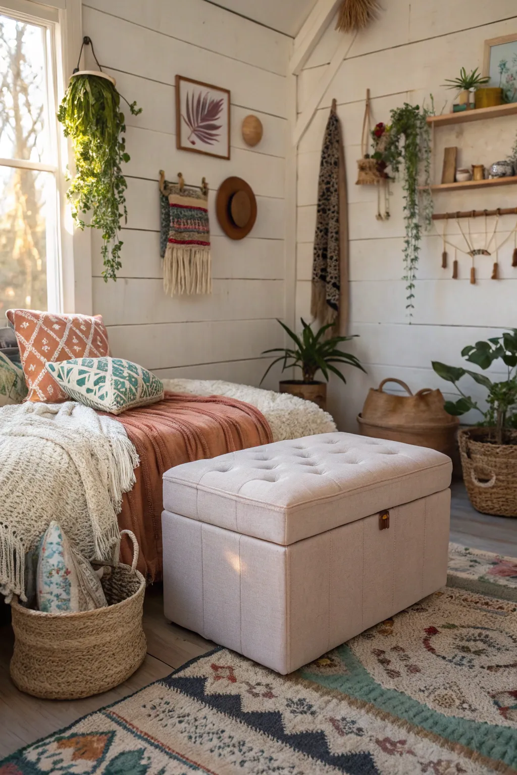 - Patterned Ground Rug: Enhance your environment with a bohemian patterned rug, grounding the space with a natural vibe.