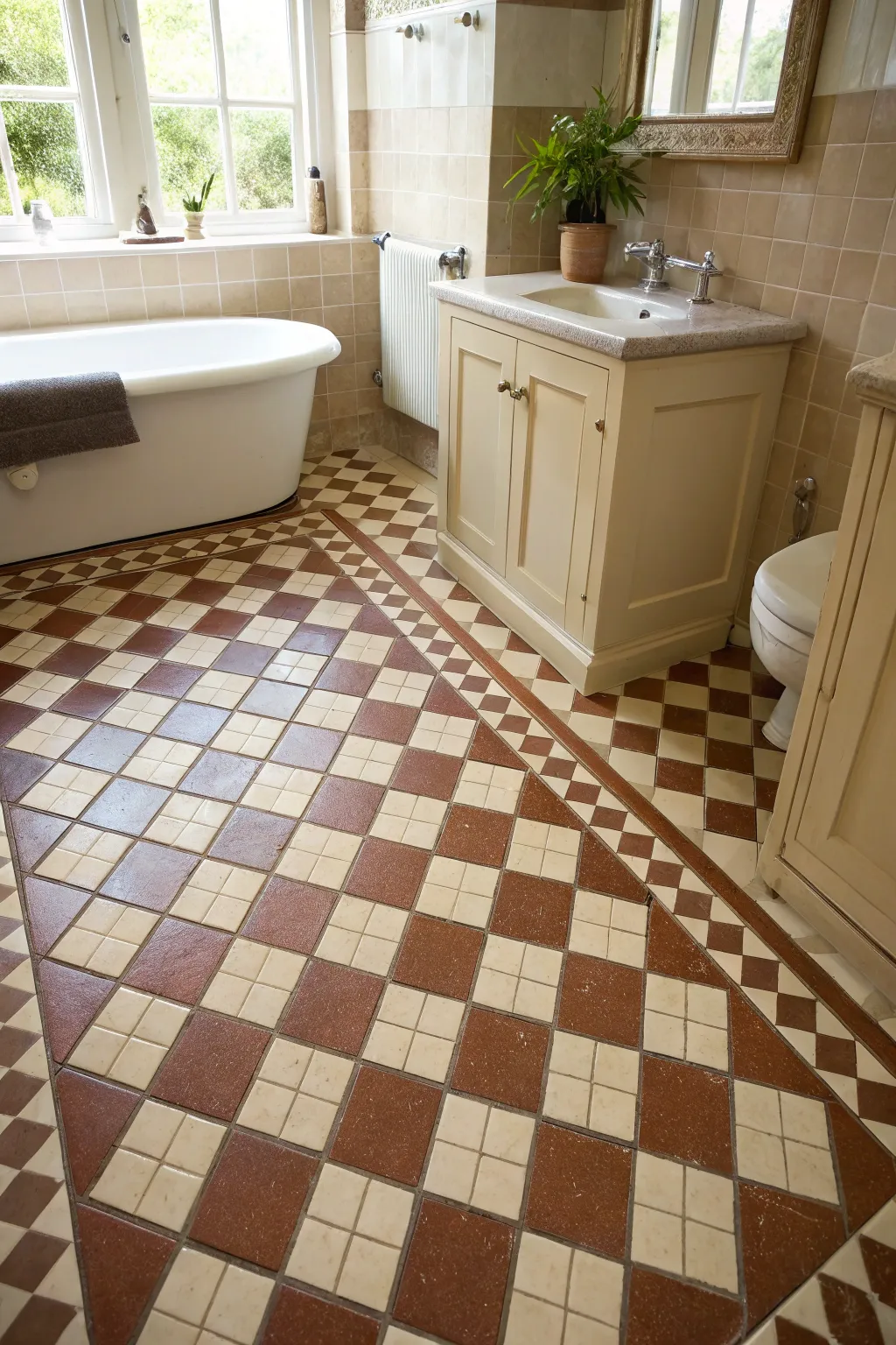 - Brown and Cream Fired Clay Tiles: Elevate your area with versatile fired clay tiles for a timeless checkerboard bathroom floor.