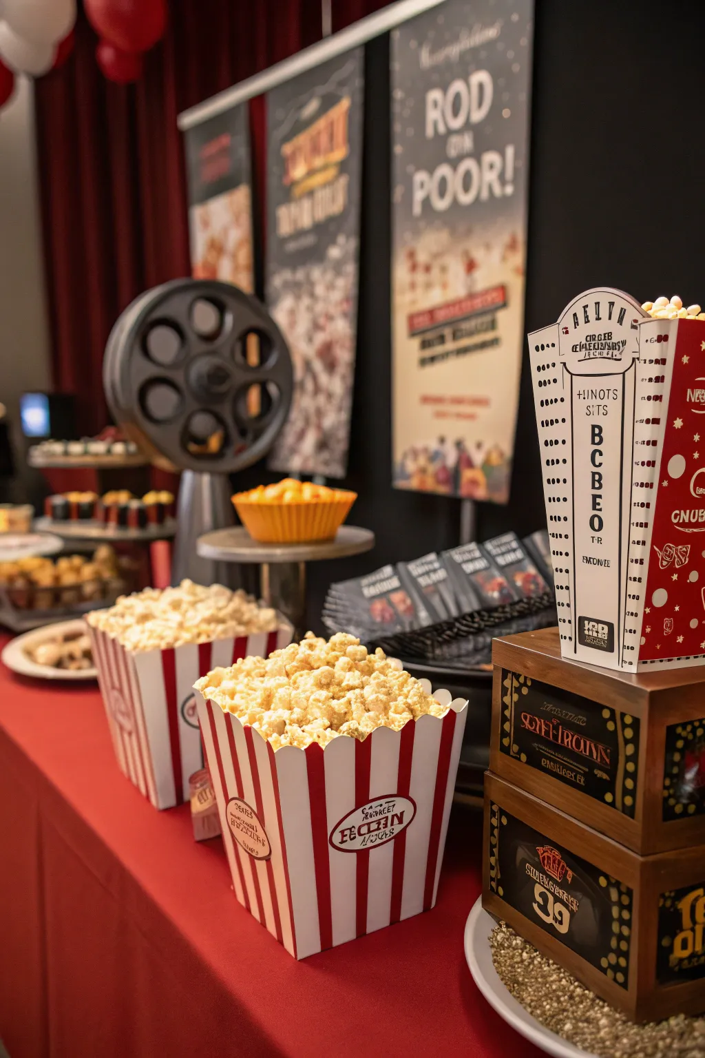 Recapture the magic of a night at the movies with beloved cinematic snacks such as caramel-flavored chews and cocoa-covered sticks. I enjoy adding old-fashioned snack boxes to complete the authentic picture.