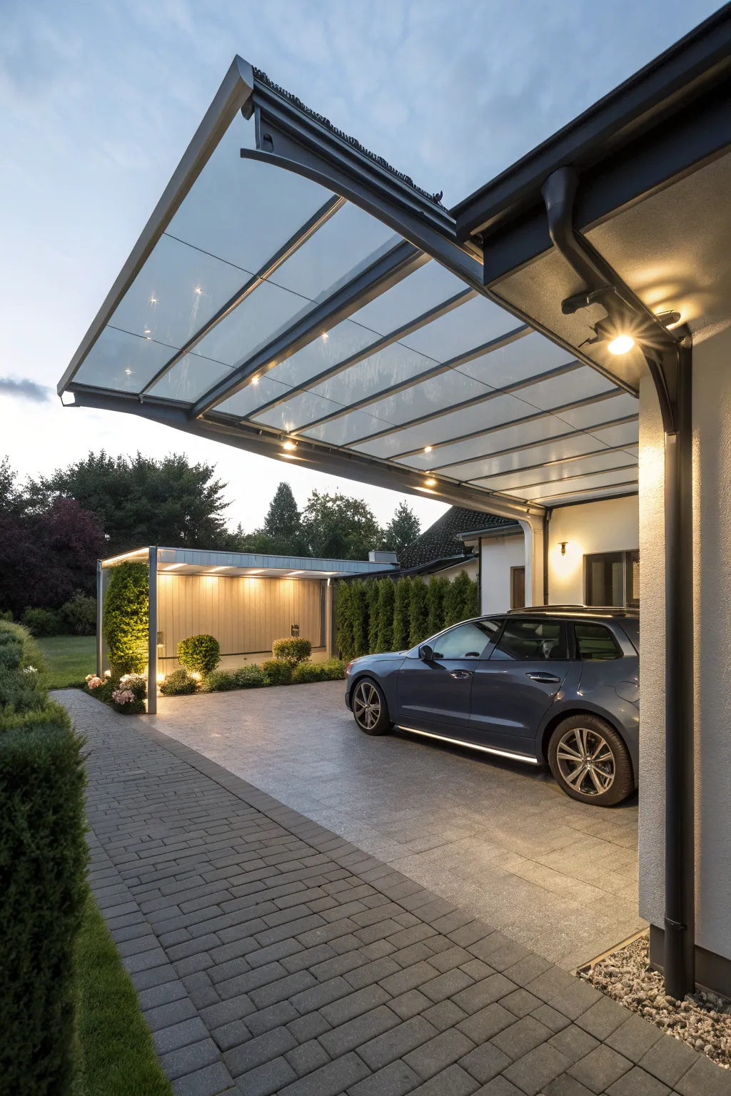 A carport featuring a glass roof, creating a bright and elegant setting.