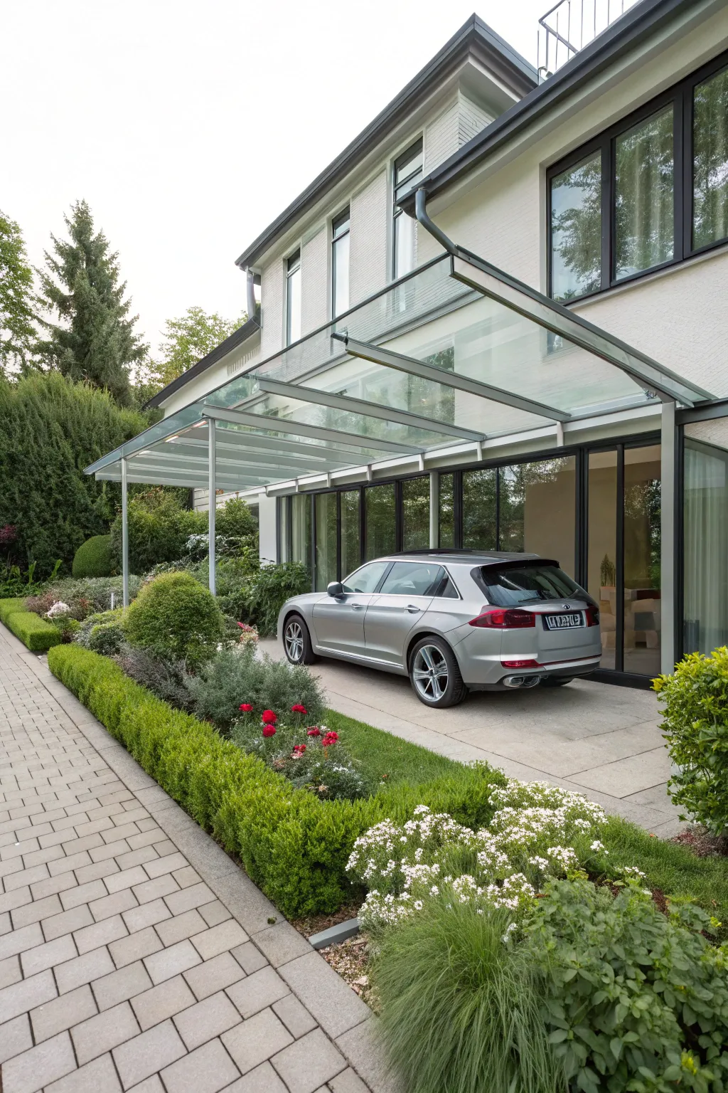 A glass-topped car shelter provides a contemporary look with optimal light exposure. This design works perfectly with modern homes, enabling natural light to enhance the area.