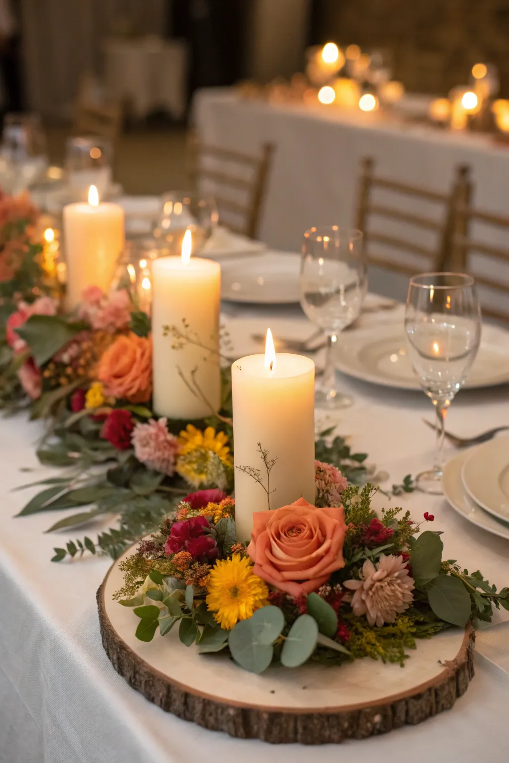 - Raw Timber Rounds: Bring a touch of countryside appeal to your centerpiece with natural raw timber rounds, ideal for situating candles.