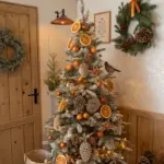 Fashion a serene and pacifying tree with minimalist embellishments in white and neutral tones. I ascertain that employing simple white baubles with a scattering of lumber features fashions a tranquil Scandinavian vibe. It’s all about straightforwardness and verdant allure.