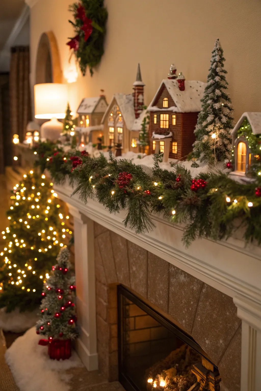 Your mantelpiece serves as an ideal setting to display a village. Introduce garlands and fairy lights for a welcoming, celebratory ambiance.
