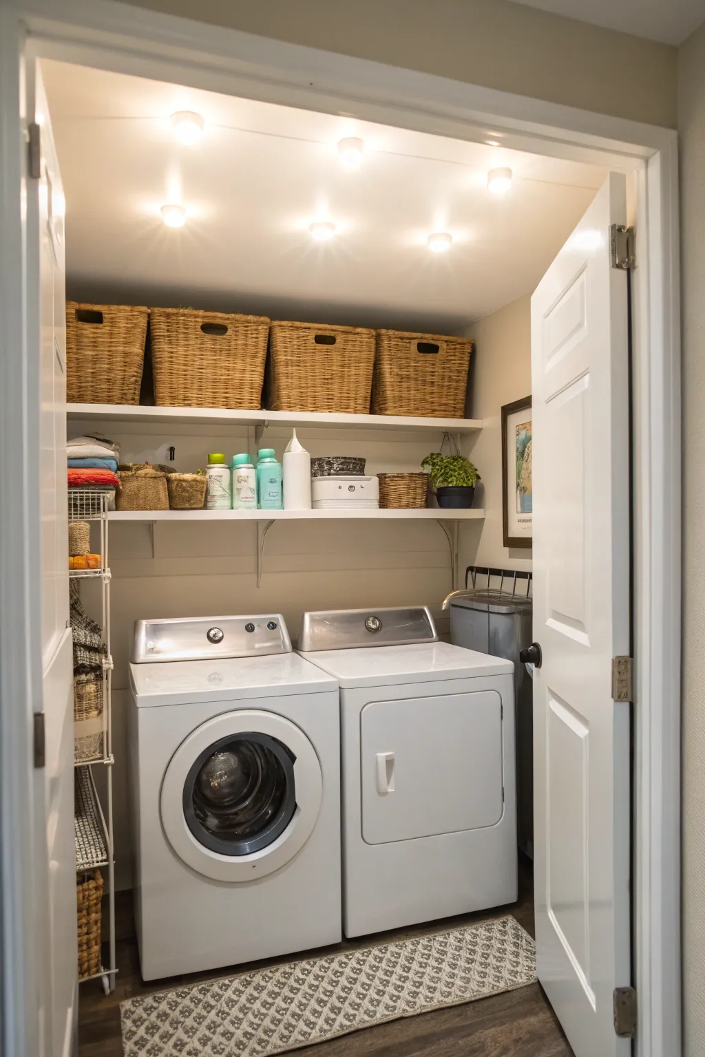 Add integrated storage units to keep your laundry space neat. This approach has greatly helped me to store all my cleaning supplies.