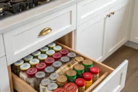 The Spinning Organizer is a time-honored method for corner cabinets, transforming those awkward spaces into rotating storage centers. I enjoy incorporating these into my designs to ensure spices and preserves are always accessible.