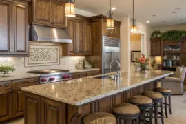 Granite countertops radiate refinement and luxury, instantly transforming your kitchen island into a captivating focal point. In my design experiences, granite’s unique natural patterns always bring an exclusive charm to the space. I find it brings that level of wow.