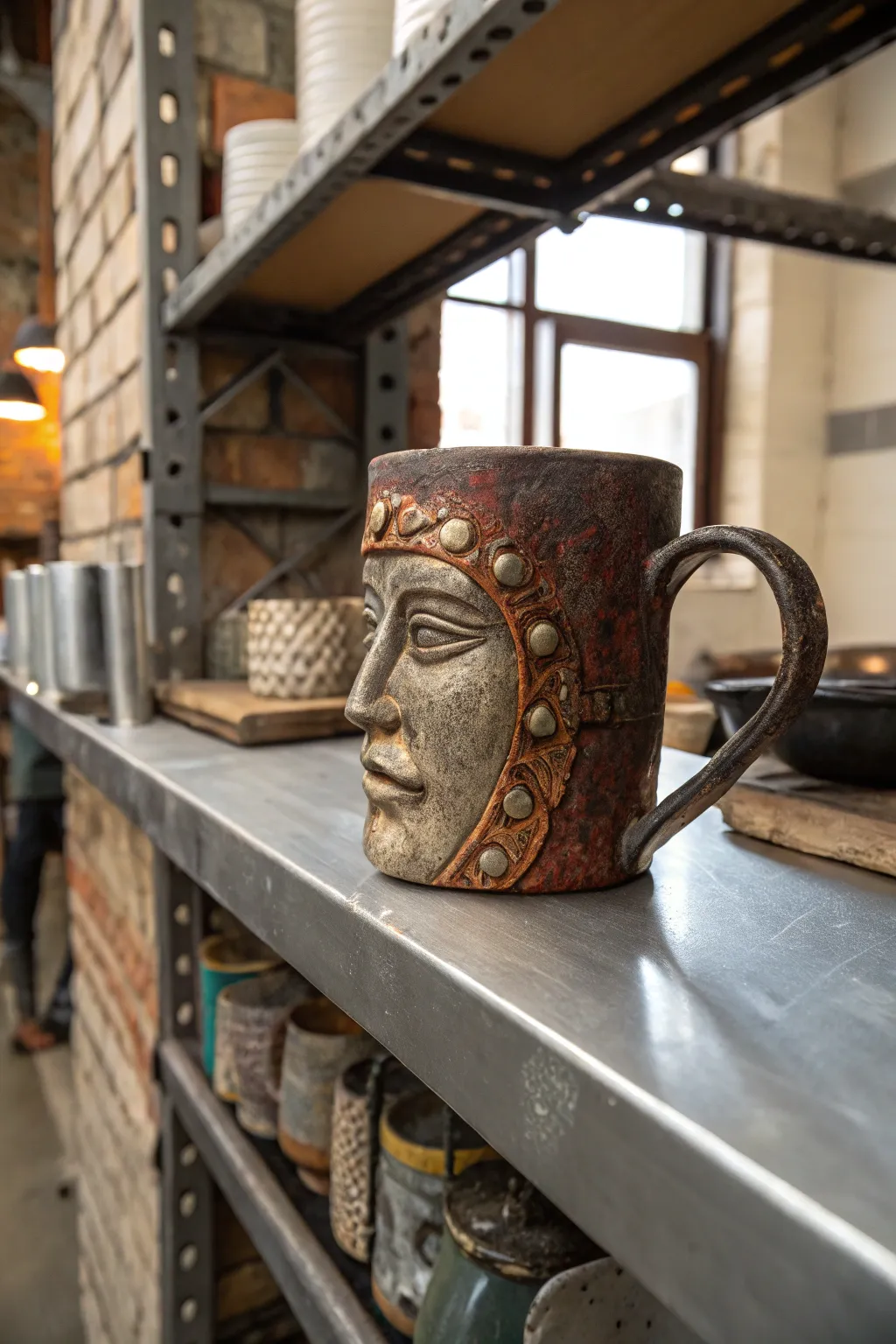 Integrate diverse materials such as clay and metal to compose mixed media face mugs for a tactile sensation. My mixed media mug stands out as an eclectic fusion introducing texture to my set. The different materials feel great!