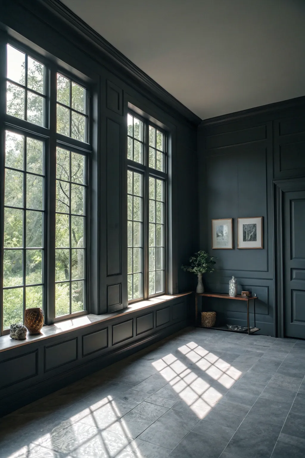 Revolutionize your living space with charcoal walls and neutral furniture. This pairing brings a balanced and enticing aesthetic.