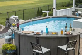 Wooden decks infuse a cozy, timeless appeal to any poolside area, harmonizing beautifully with the natural landscape. I’m fond of employing treated lumber for its robust nature, providing both visual charm and lasting quality.