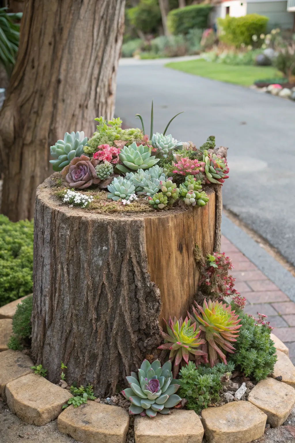 - Varied Hearty Plants: Grow an assortment of textured and colorful succulents on your tree stump for a striking display.