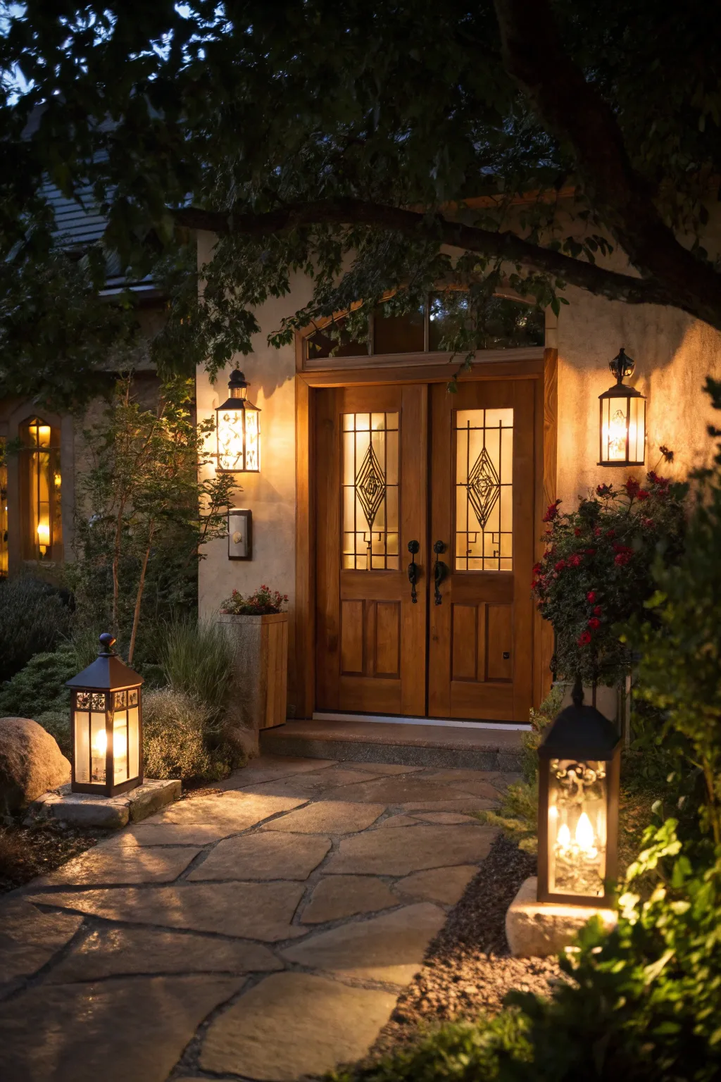 Surrounding your double doors through lamps can offer a welcoming and comfortable radiance. I believe this introduces an inviting feature, especially during the night, when the soft light highlights the beauty of your doorway.