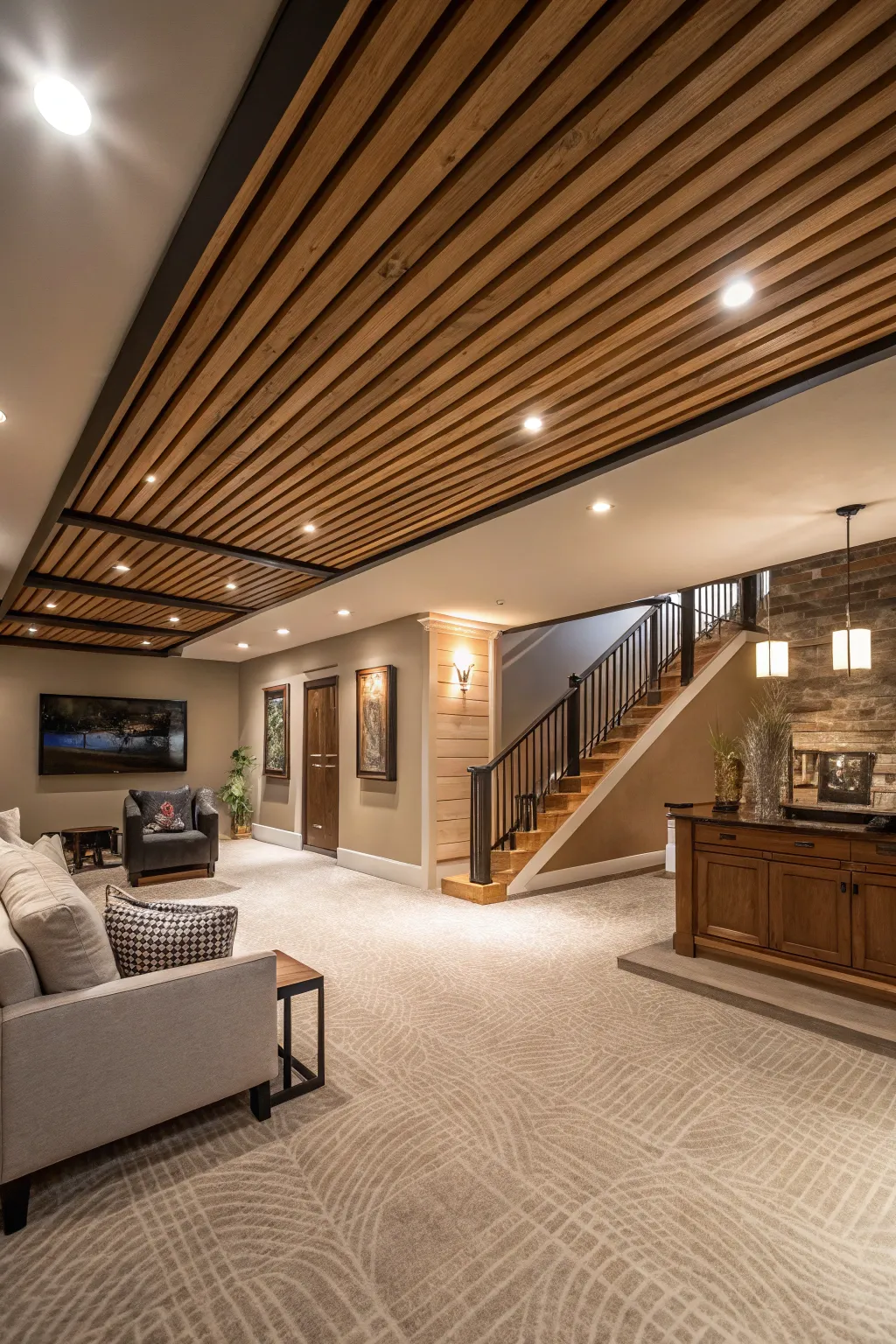 Adding timber supports can instantly warm up your basement and create a rustic atmosphere. In one of my previous projects, I paired wood with delicate lighting to craft a comfortable escape.