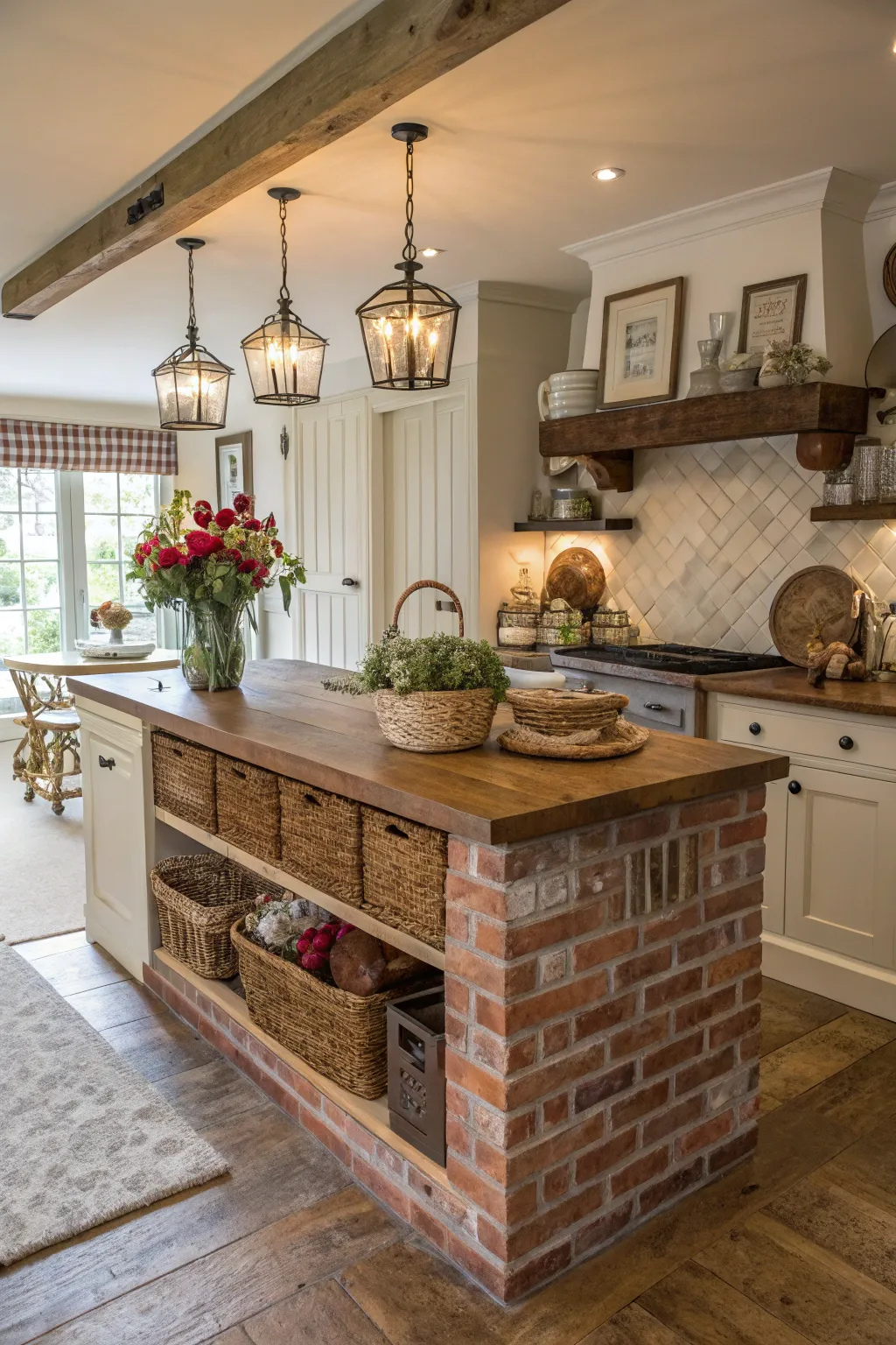 Adding brick details to your island can fashion a countryside and grounded aesthetic. I find it beautifully enhances the cozy atmosphere of a farmhouse cooking area.