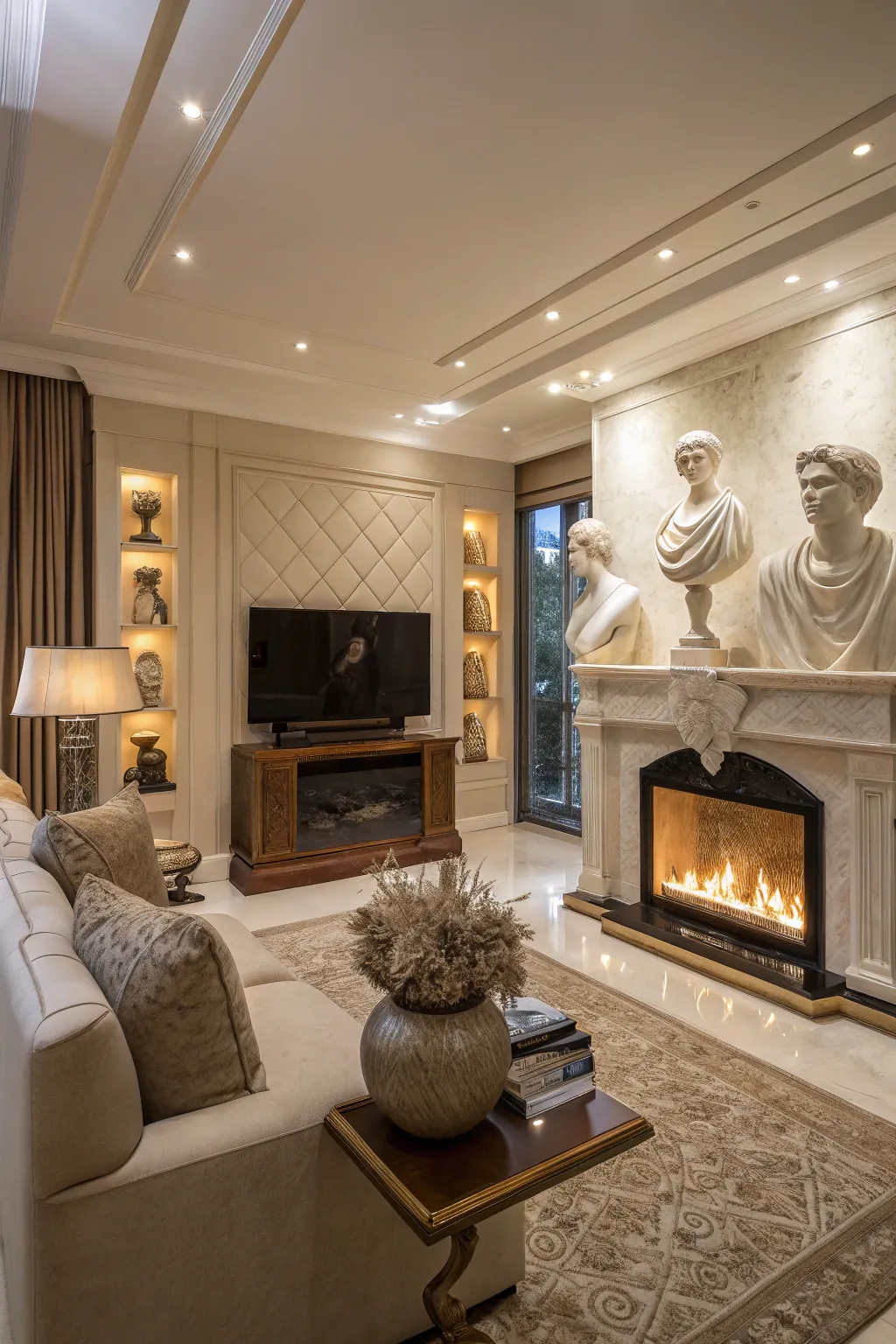 Incorporate sculptures or art pieces around your fireplace for an artful arrangement. It’s a strategy I adore for introducing a hint of sophistication and rendering the area genuinely unique.