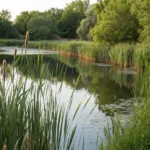 A peaceful water feature surrounded by rich greenery.