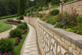 Ornamental stone bordering can emphasize the confines of your garden with elegance. I’ve observed its capacity to deliver a polished appearance, carving out defined edges around planting plots.