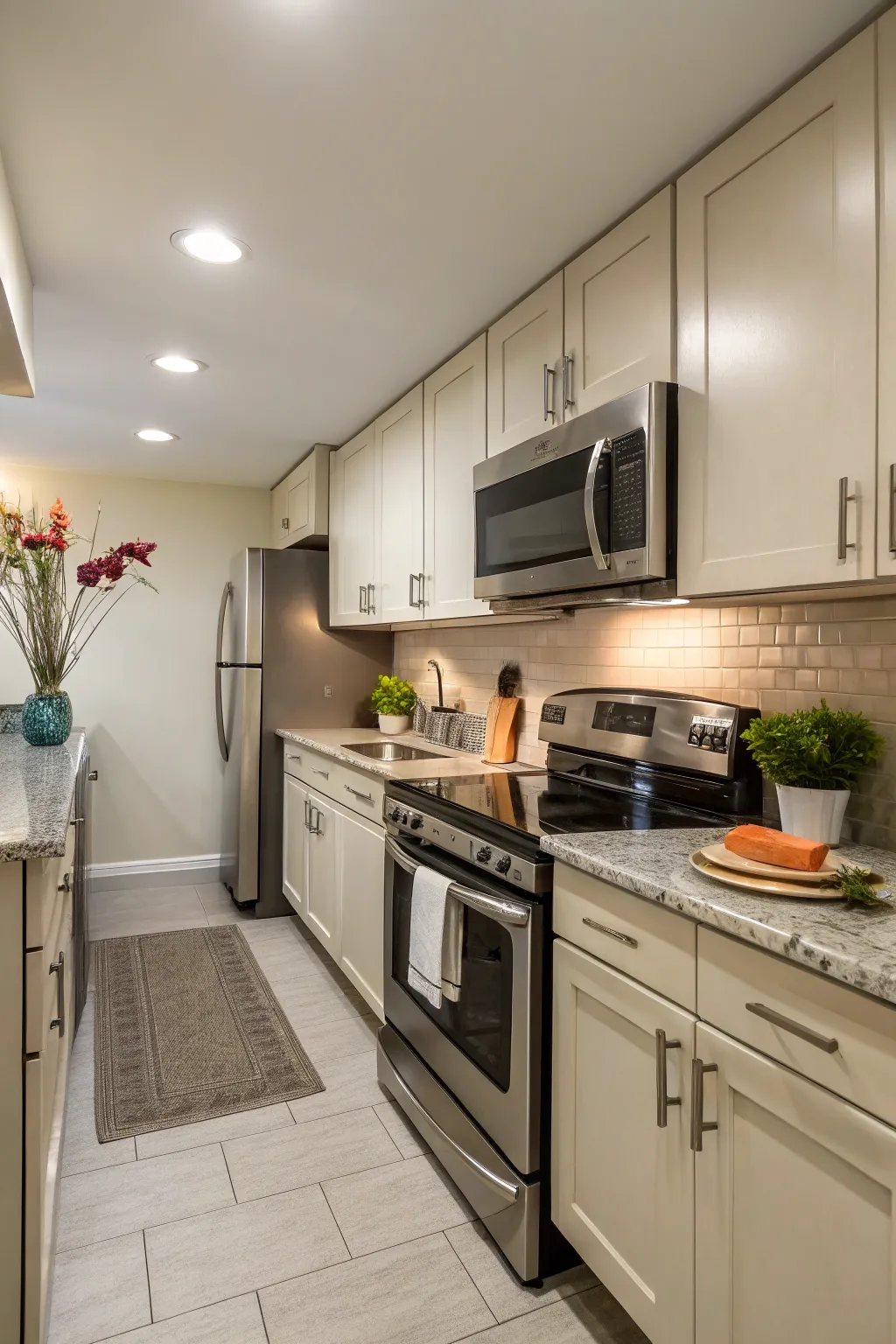 Improve visibility and ambiance with under-cabinet lighting. I frequently suggest this to clients who want to add both functionality and a cozy feel.