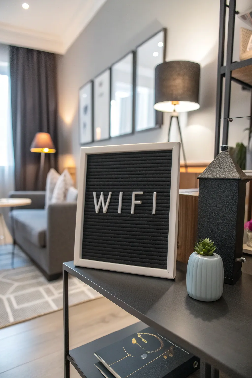 Utilize a message board to display your WiFi details with a fashionable flair. The changeable nature of these boards lets you refresh messages effortlessly, introducing a dynamic aspect to your interior.