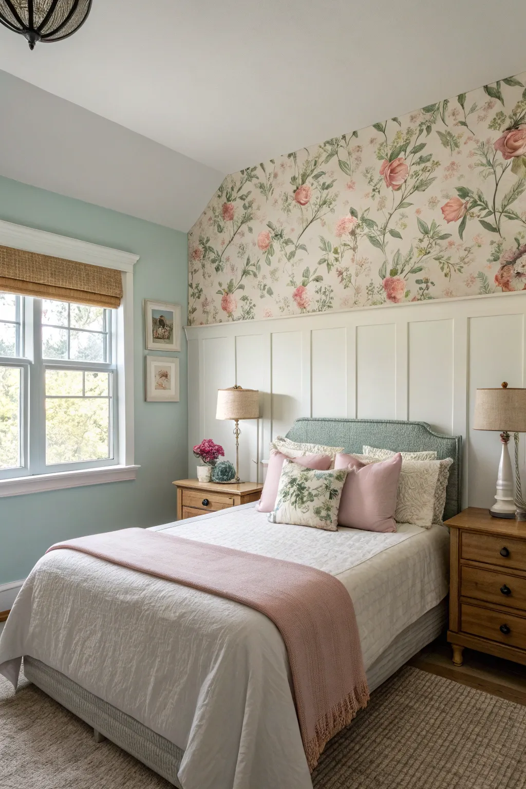 Impart a romantic ambiance with floral-themed wallcoverings covering the upper portion of the walls, paired with gentle pastel paint below. This combination is perfect for bedrooms, creating a whimsical and dreamy atmosphere.