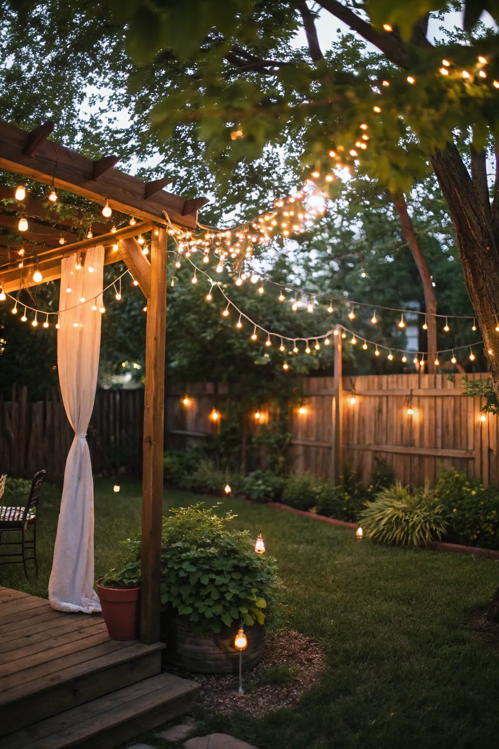 Create a captivating outdoor scene by suspending twinkle lights across your backyard. I’ve noticed that varying the height and density of the lights adds a genuinely magical touch.