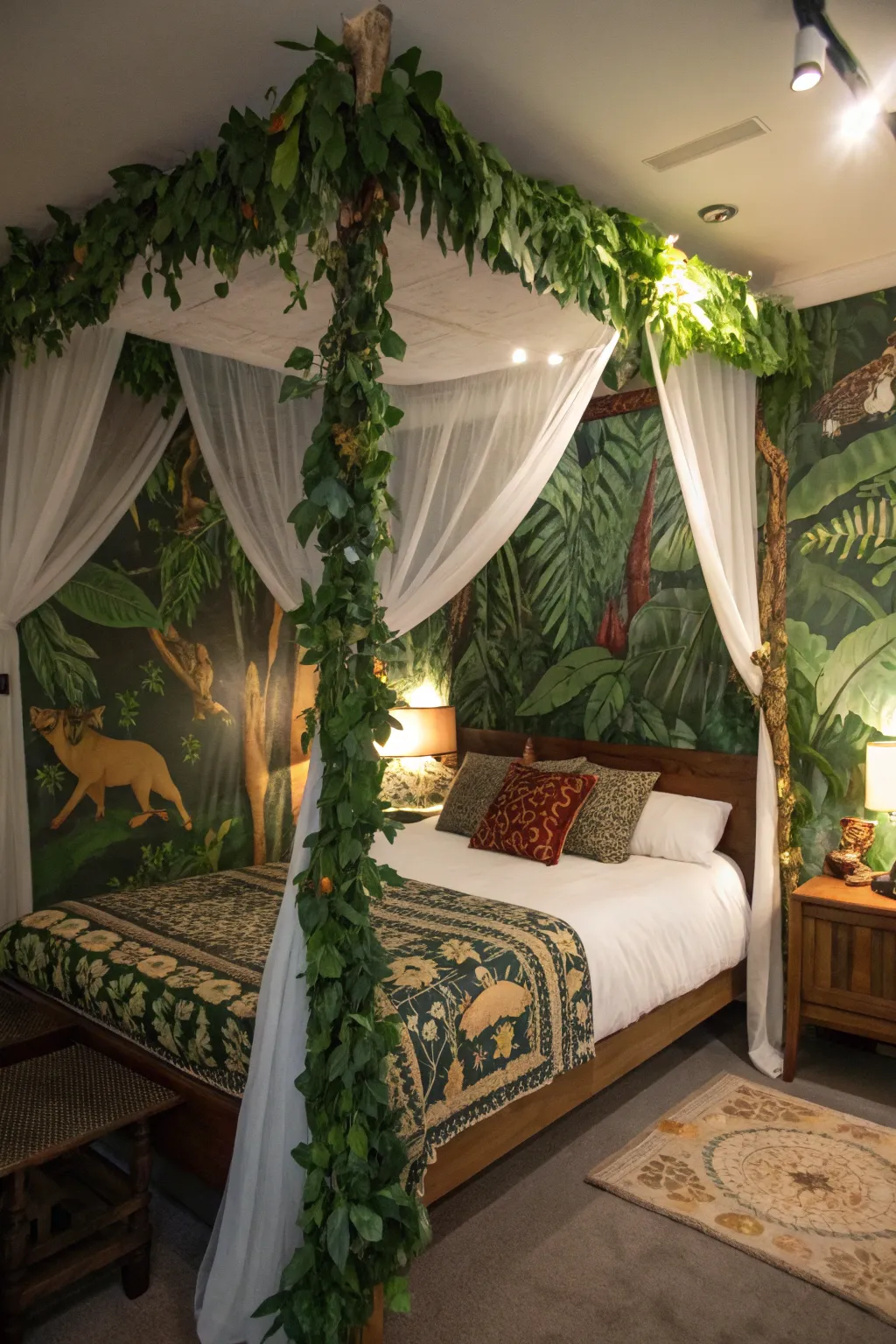Think about using wall coverings that feature jungle themes to establish the mood. I once decorated using a mural with tropical foliage and wildlife, which instantly transformed the room into an exotic jungle retreat.