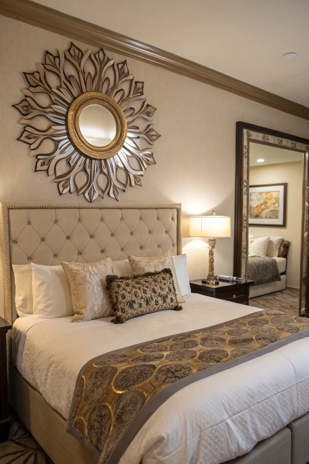 - Gleaming Halo Wall Decor: Enhance your headboard with this striking sunburst-style mirror, effortlessly establishing an artistic focal point.