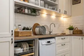 If your culinary space has a partition recess, convert it into a display for your chopping surfaces. It’s an ingenious method to capitalize on architectural elements.