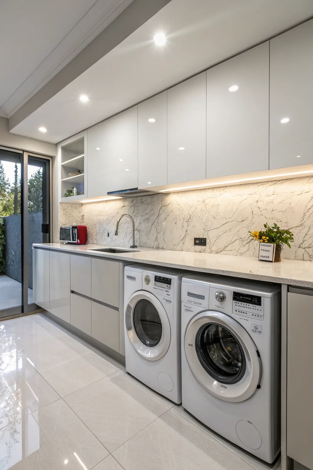 Explore a linear design for your washer and dryer. This streamlined layout keeps everything within easy reach, a configuration I recommend for its practicality in small spaces.