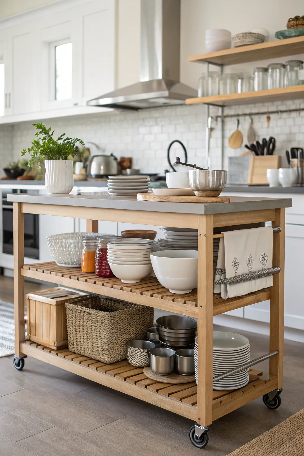 - Rolling Kitchen Island: Optimize kitchen space using a sleek, rolling island, featuring shelves!