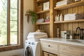 Install fold-out drying racks to save area and dry clothes efficiently. This clever design is a lifesaver in compact areas.