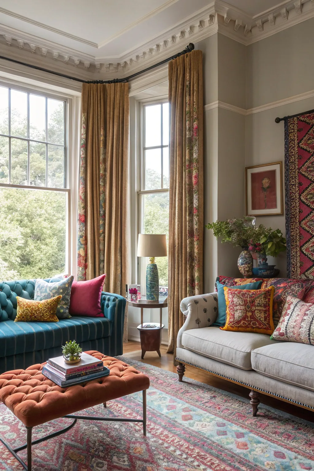 Try unconventional hanging styles, like ceiling-mounted rods, for a distinctive aesthetic. This can contribute elevation and drama to your family room.