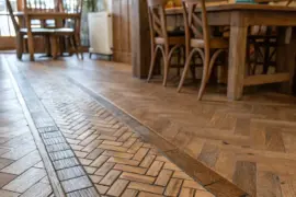 Introduce home-style elements such as timber beams or a farmhouse table. This juxtaposition of rustic charm with elegant pale floors creates a balanced and inviting space.