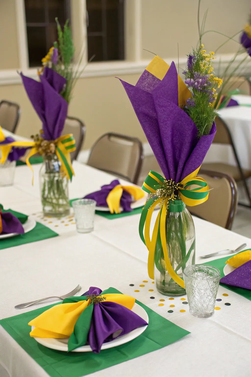 Arrange your table with dinnerware and napkins in the signature Mardi Gras shades. This offers a straightforward approach to integrate the theme and make each meal feel exceptional.