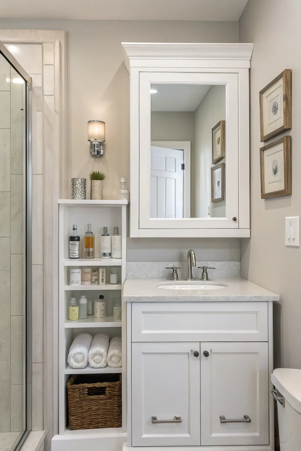 • Inset Medicine Cabinet: Enhance your bathroom’s sophistication with a streamlined inset cabinet that offers a seamless, minimalist appearance.