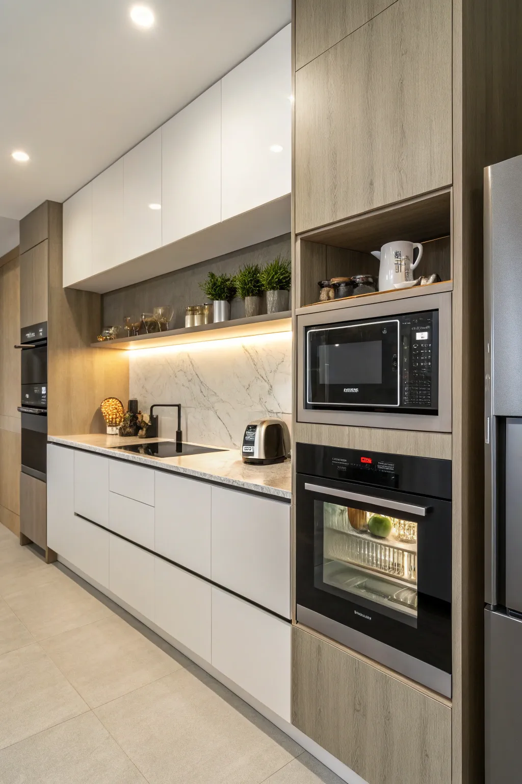 For the ultimate in modern design, try a recessed wall microwave. This option makes your appliance blend right into the wall, providing a custom, high-end look. I’ve used this in a few designs to create a truly bespoke kitchen appearance.