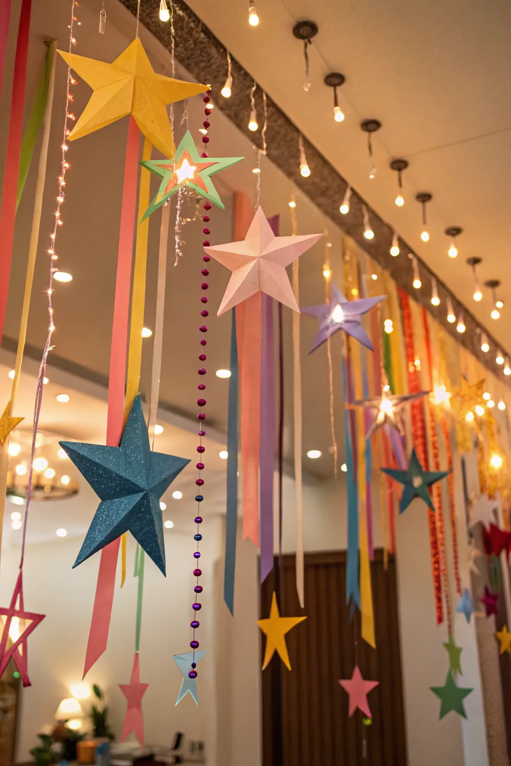 Ornamental star cutouts and ribbons contribute a lively, celebratory aspect to the décor. I appreciate how they flutter in the air, catching the light beautifully.