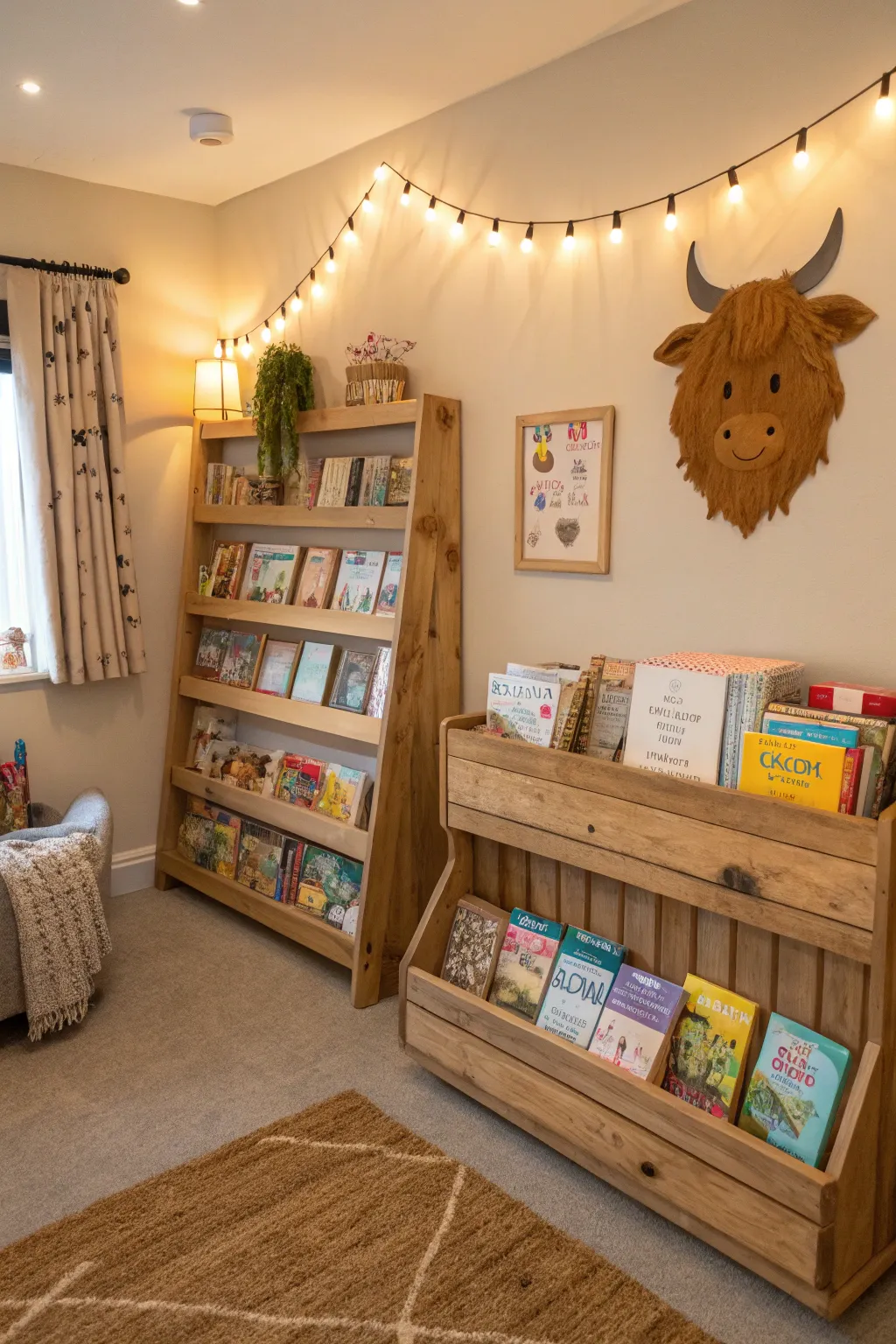Install rustic bookshelves to display children’s books and decor items. I often pick upcycled wood shelves that add character and functionality to the space.