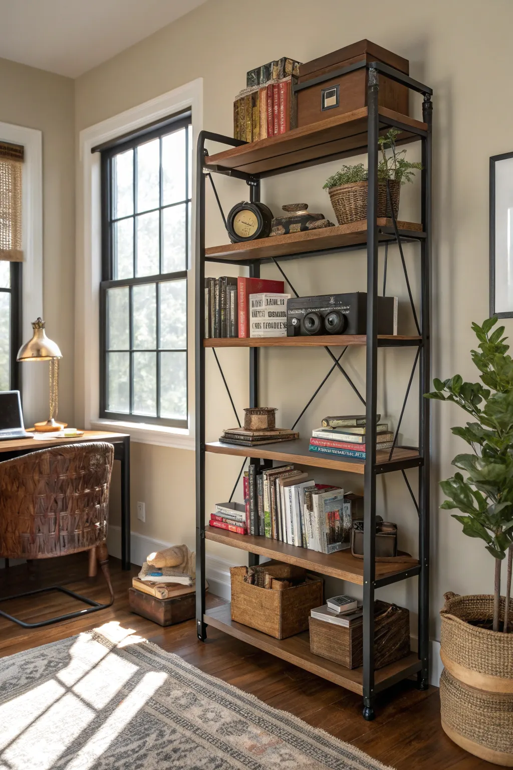 - Wood and Metal Bookshelf: Improve your space with a sturdy wood and metal bookshelf for a layered aesthetic.