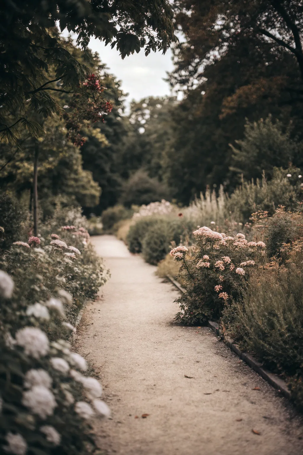 A garden walkway utilizing monochromatic tones for a cohesive aesthetic.