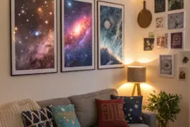 Undertake a voyage to outer space featuring a neon cosmic cluster painting. It’s the centerpiece of my media space, setting the mood for cinematic evenings.