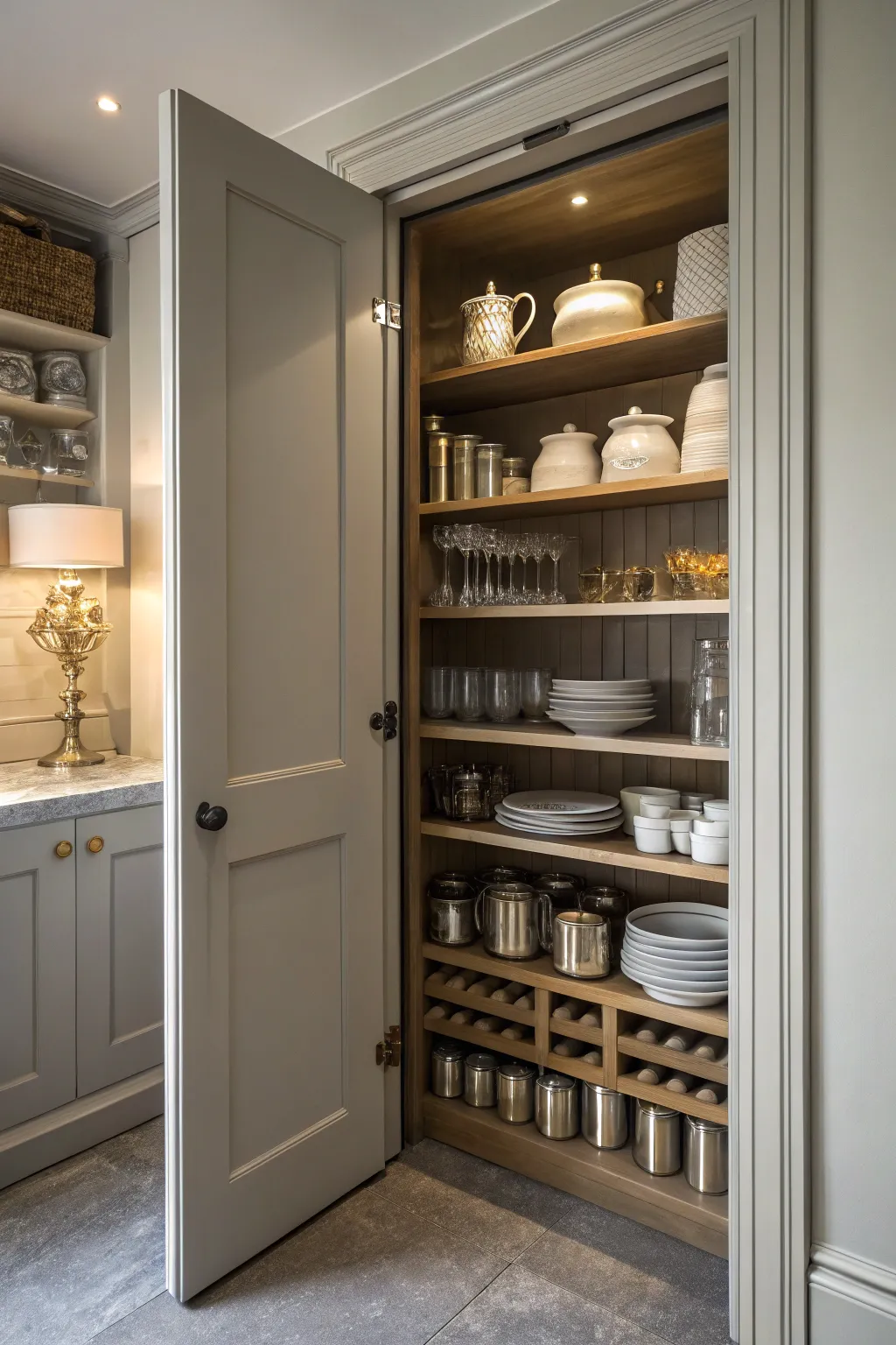 A hidden pantry situated behind a secret door provides both enjoyment and utility. I value the unexpected surprise it introduces to my kitchen area.