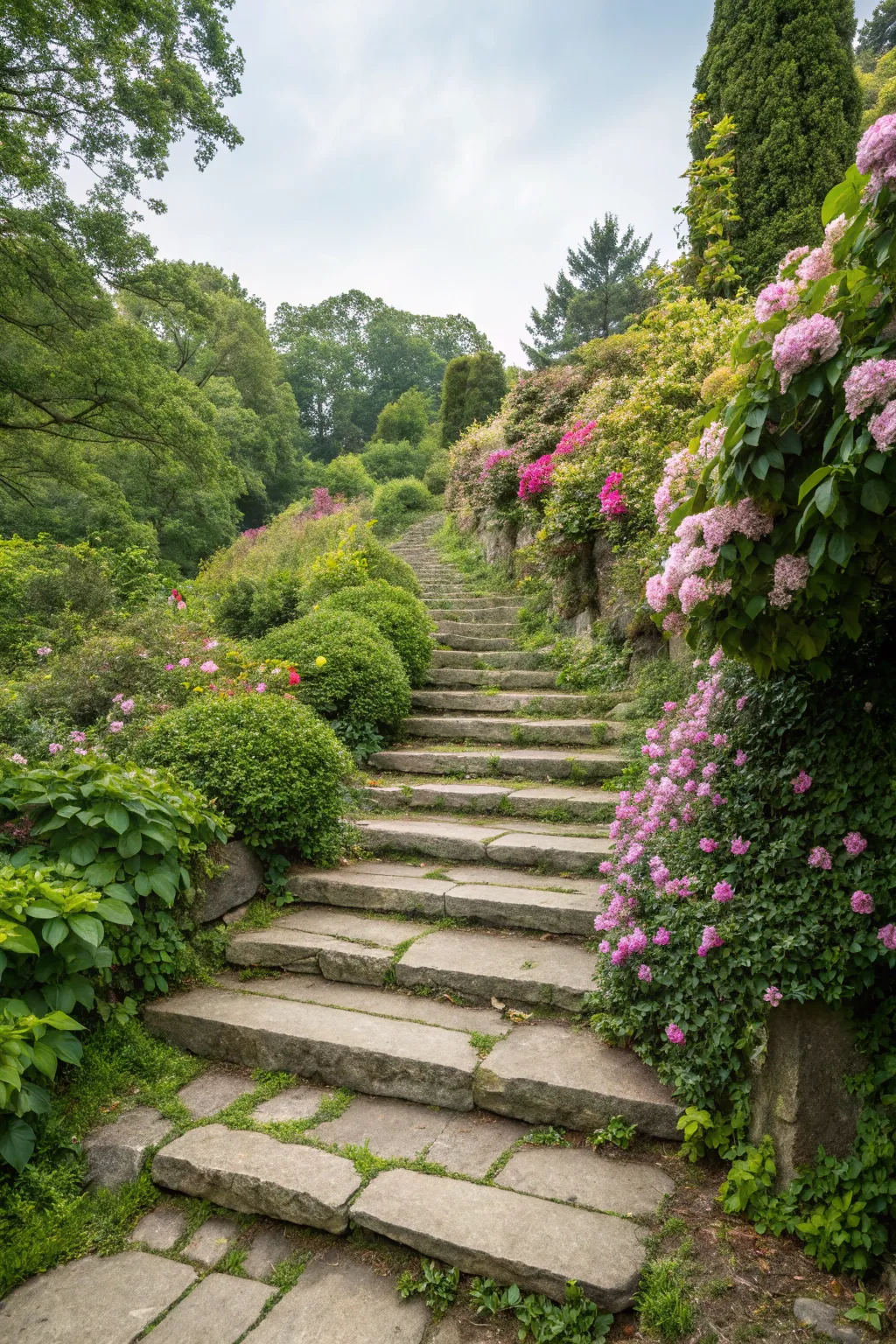 Construct natural stone ascents to create a dramatic effect on sloping terrains. These ascents in my garden not only look fantastic but also provide practical functionality!
